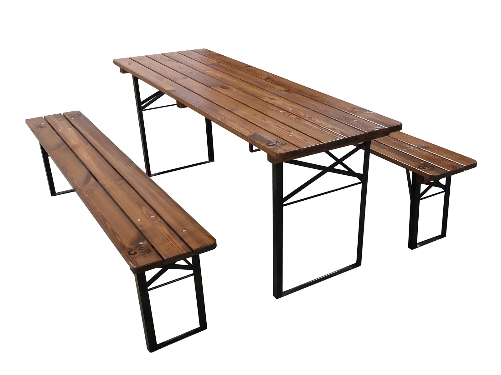 Bawarski zestaw piwny wykonany z drewna sosnowego pokrytego wysokiej jakości lakierem zabezpieczającym mebel przed niekorzystnym działaniem warunków atmosferycznych.
